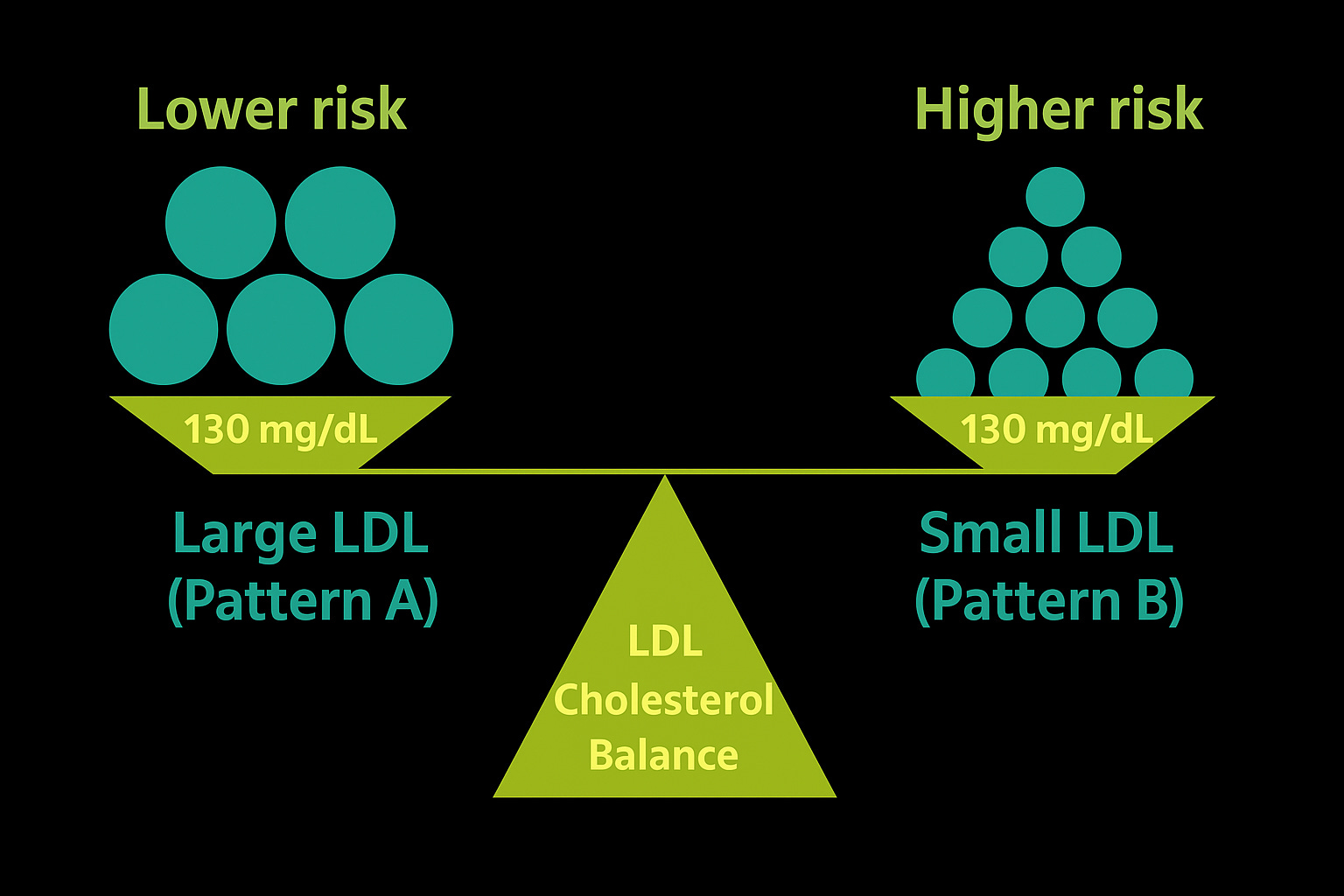Two people can have the same LDL-C (130 mg/dL), but very different risks. Large LDL particles (Pattern A) mean fewer particles, while small LDL particles (Pattern B) mean many more. What really reflects this difference is ApoB — a direct count of particle number, and a far better predictor of risk than LDL-C alone.