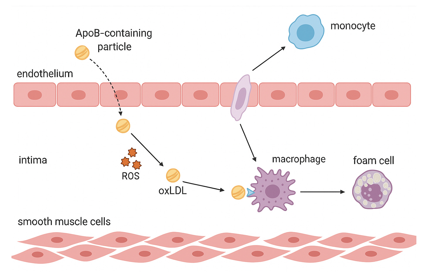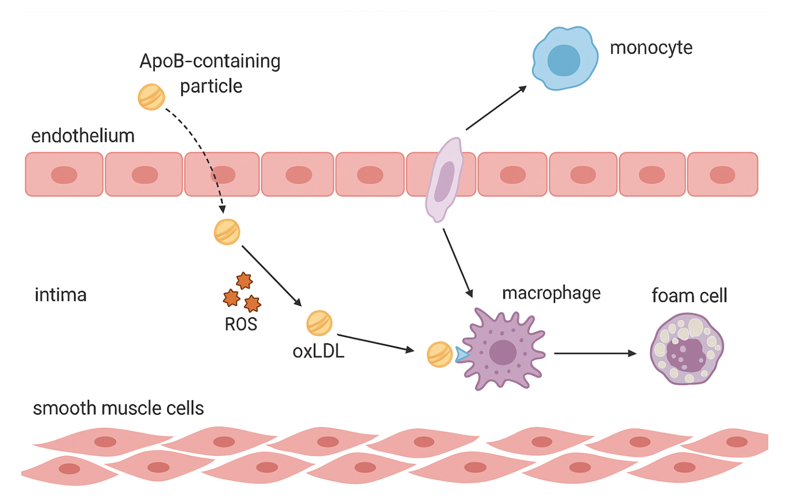 ApoB-containing particles cross the endothelium and become trapped in the intima. Once retained, they undergo oxidative modification. This triggers an inflammatory response, recruiting monocytes from the bloodstream. The monocytes migrate into the intima, transform into macrophages, and begin engulfing the modified particles, forming lipid-laden foam cells. This marks the early stage of atherosclerotic plaque development.